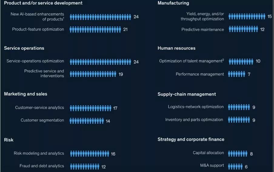 從公司內部業(yè)務線看,下圖顯示了各部門的AI使用率(單位:%):