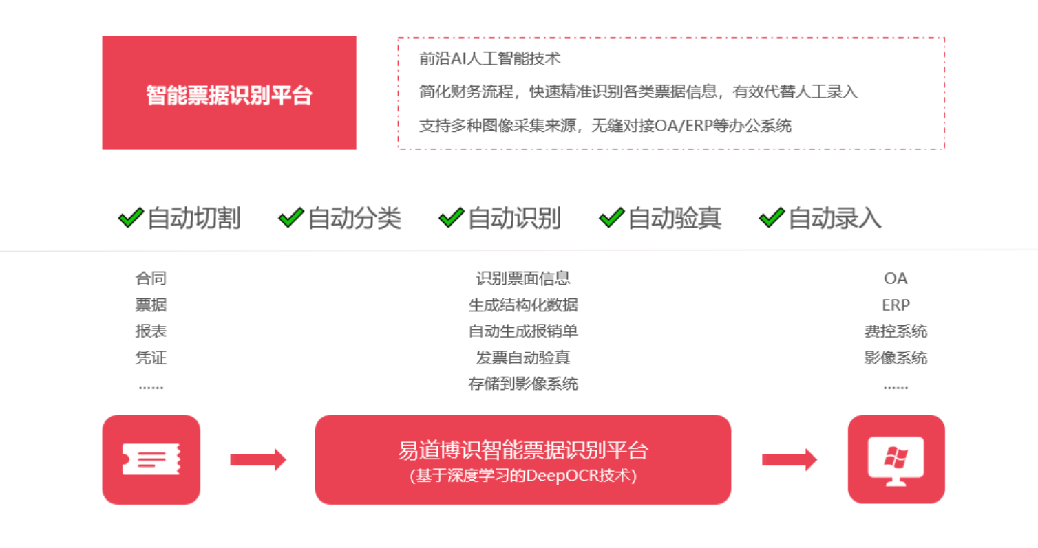 易道博識以發票識別技術為主的智能OCR識別技術應用在財務管理中,幫助實現賬務自動化處理,可以自動分類識別單據內容,自動生成系統對應業務單據,直接對接到OA/ERP系統,免去人工錄入的麻煩,大大提高業務處理速度及準確性,為企業降低大量的運營成本。