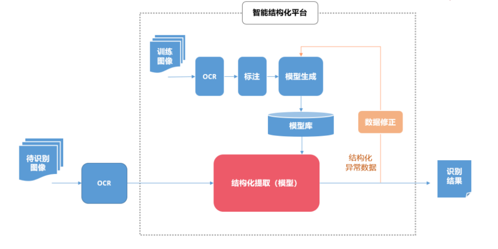 在OCR識別流程中,原始圖像經過文本定位和文本識別,在確定了文本位置和文本內容之后,將識別內容通過智能結構化平臺進行數據結構化,若數據的模型評價通過,則可進行模型發布。