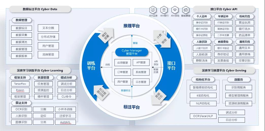 賽博(Cybot)學習平臺(簡稱平臺)是易道博識基于深度學習自主研發(fā)的一站式全周期數(shù)據(jù)服務平臺。平臺包含Cyber Data數(shù)據(jù)標注平臺、Cyber Learning深度學習訓練平臺、Cyber Serving深度學習推理平臺、Cyber API 接口平臺、Cyber Manager管理平臺5大平臺,涵蓋數(shù)據(jù)標注,數(shù)據(jù)訓練、推理服務三大數(shù)據(jù)服務環(huán)節(jié)。