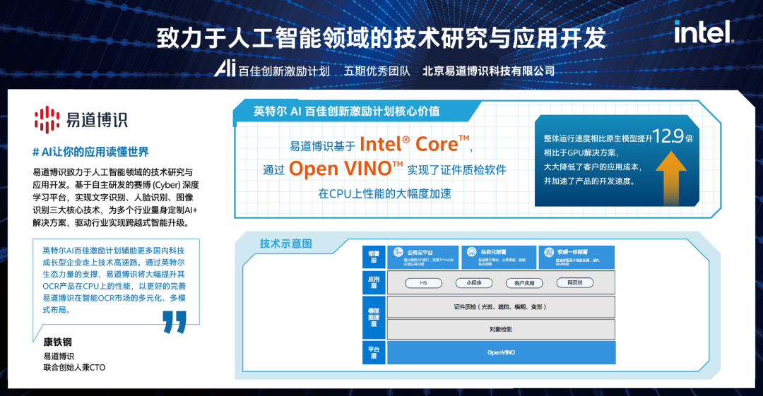 這是一場(chǎng)由英特爾AI百佳創(chuàng)新計(jì)劃(2021 AI 100 Connect Webinar)邀請(qǐng)一眾行業(yè)專家圍繞AI+企業(yè)數(shù)字化轉(zhuǎn)型展開的線上分享會(huì)。有資格被邀請(qǐng)參會(huì)的企業(yè)寥寥無(wú)幾,因?yàn)檫@意味著他們還要擁有另一個(gè)身份:在和英特爾的技術(shù)合作下取得了行業(yè)的重大創(chuàng)新和突破。