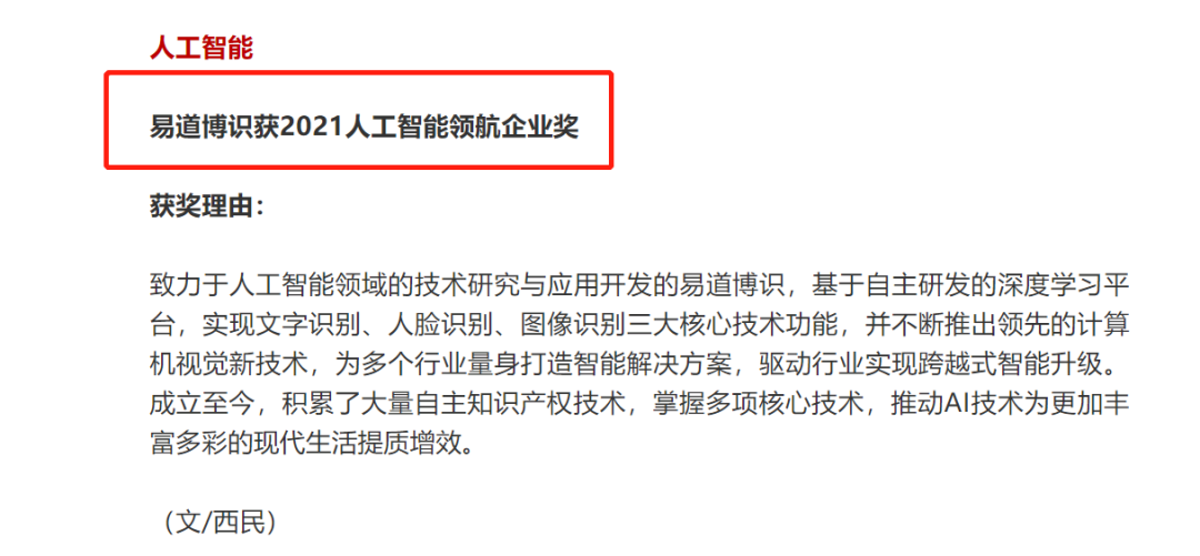 12月18日,由中國(guó)科學(xué)院《互聯(lián)網(wǎng)周刊》、中國(guó)社會(huì)科學(xué)院信息化研究中心、eNet研究院、德本咨詢聯(lián)合主辦的2021(第十九屆)中國(guó)互聯(lián)網(wǎng)經(jīng)濟(jì)論壇正式拉開(kāi)帷幕,備受矚目的年度金i獎(jiǎng)獲獎(jiǎng)名單也最終揭曉。易道博識(shí)憑借業(yè)界領(lǐng)先的產(chǎn)品創(chuàng)新及用戶服務(wù),成功獲評(píng)“2021人工智能領(lǐng)航企業(yè)獎(jiǎng)”。