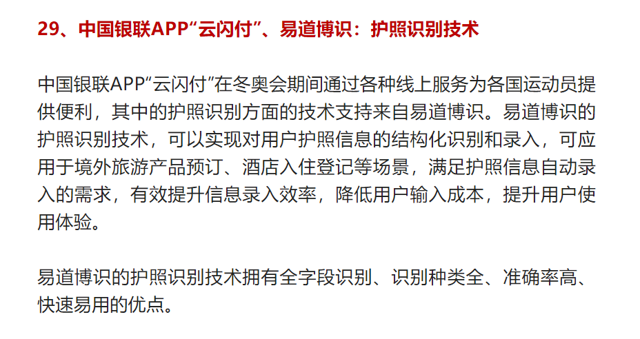 冬奧會(huì)上匯集了各個(gè)領(lǐng)域最頂尖的科技,各個(gè)企業(yè)八仙過(guò)海各顯神通,都拿出自己引以為傲的金牌產(chǎn)品。中國(guó)銀聯(lián)的APP“云閃付”,就通過(guò)各種線上服務(wù)為各國(guó)運(yùn)動(dòng)員提供便利,而其中的護(hù)照識(shí)別方面的技術(shù)支持,來(lái)自易道博識(shí)。