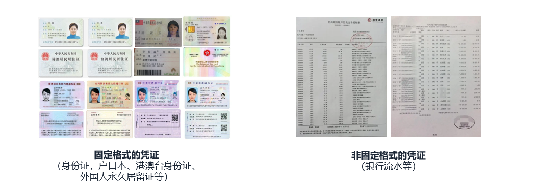 隨著金融業(yè)務(wù)的發(fā)展,越來越多的業(yè)務(wù)線中涉及的紙質(zhì)憑證影像需要用到OCR自動(dòng)處理,來進(jìn)一步提升業(yè)務(wù)辦理的效率。從企業(yè)內(nèi)部的數(shù)據(jù)類型來看,這些憑證影像按照格式可以分為兩類:一類是固定格式的憑證(戶口本、港澳臺(tái)身份證、外國人永久居留證等),占整體90%以上;一類是非固定格式的憑證(銀行流水等)。這些憑證存在以下特點(diǎn):