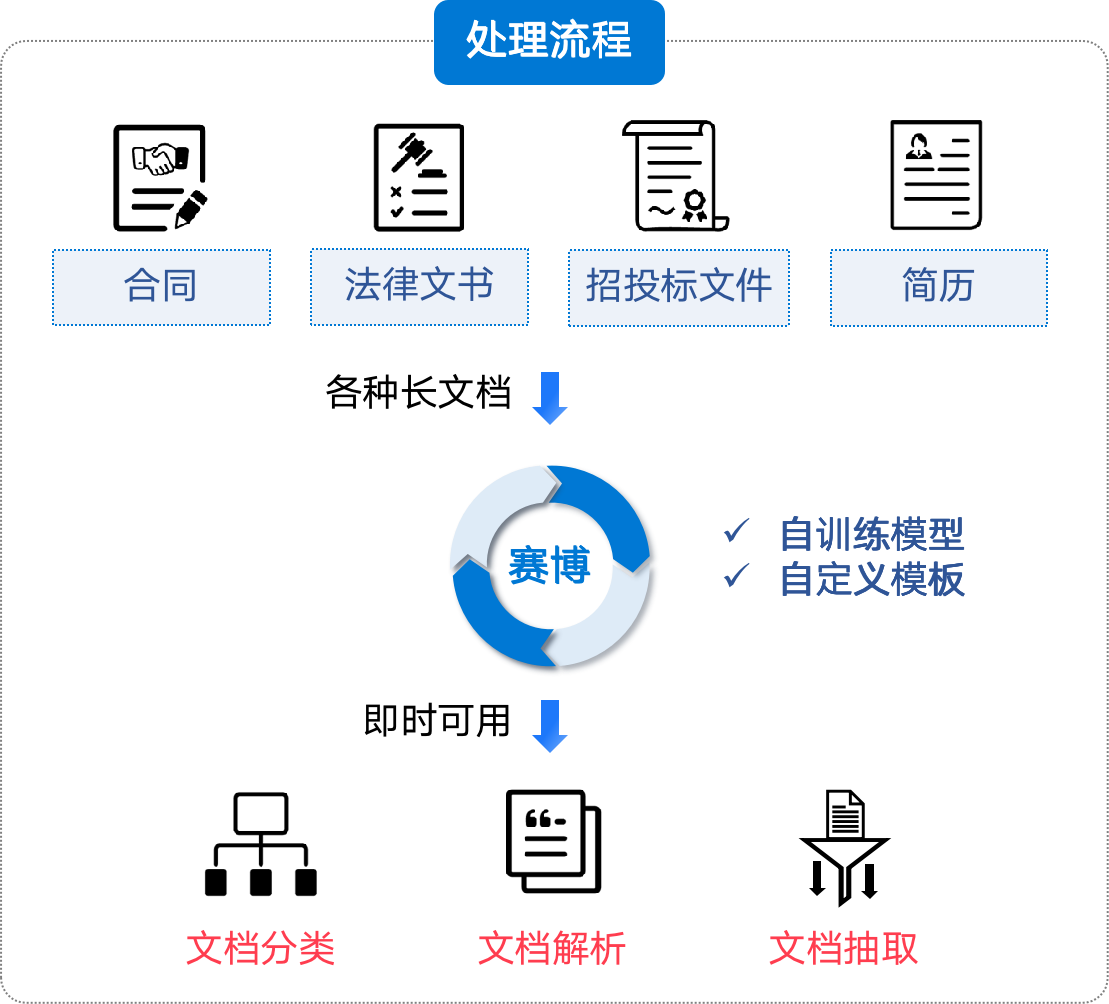 通過智能文檔處理技術(shù),可以構(gòu)建智能問答系統(tǒng),為用戶提供及時準確的文檔內(nèi)容信息。未來隨著大模型等人工智能技術(shù)的不斷發(fā)展,智能文檔處理將會在各個行業(yè)的應用場景中不斷普及化。賽博智能學習平臺定位于一體化機器學習訓練平臺,集成了對于結(jié)構(gòu)化和非結(jié)構(gòu)文檔的智能化處理功能,包括智能文檔分類、文檔解析和文檔信息抽取等。能夠支持合同、法律文書、招投標文件等各種開放版式長文檔的智能化處理。基于平臺自定義模板和自訓練模型能力,通過現(xiàn)場模板定制、模型標注訓練的方式,能夠形成即時可用的文檔AI能力。如下圖,是賽博智能學習平臺智能文檔處理的基本流程。