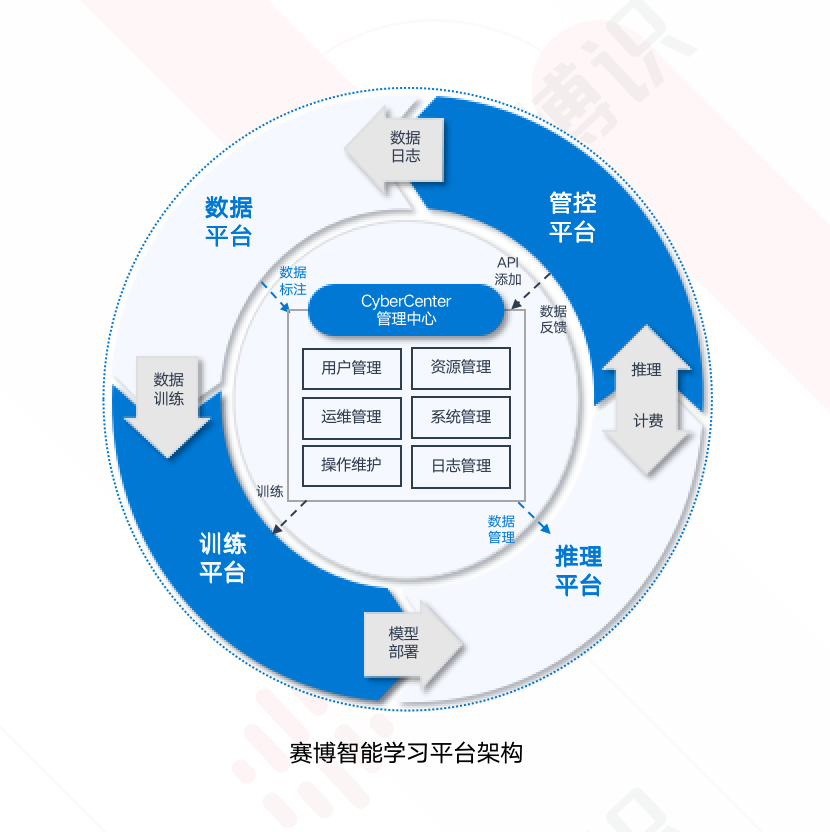 產(chǎn)品組成上,賽博智能學(xué)習(xí)平臺由管理中心、數(shù)據(jù)標注平臺、深度學(xué)習(xí)訓(xùn)練平臺和深度學(xué)習(xí)推理平臺幾個子平臺組成,各子平臺依次承擔平臺管理、數(shù)據(jù)管理與標注、模型訓(xùn)練和模型服務(wù)的功能,各個子平臺之間相互獨立又有效配合,形成一個有機整體,從而有效支撐數(shù)據(jù)驅(qū)動模型應(yīng)用的整體功能。