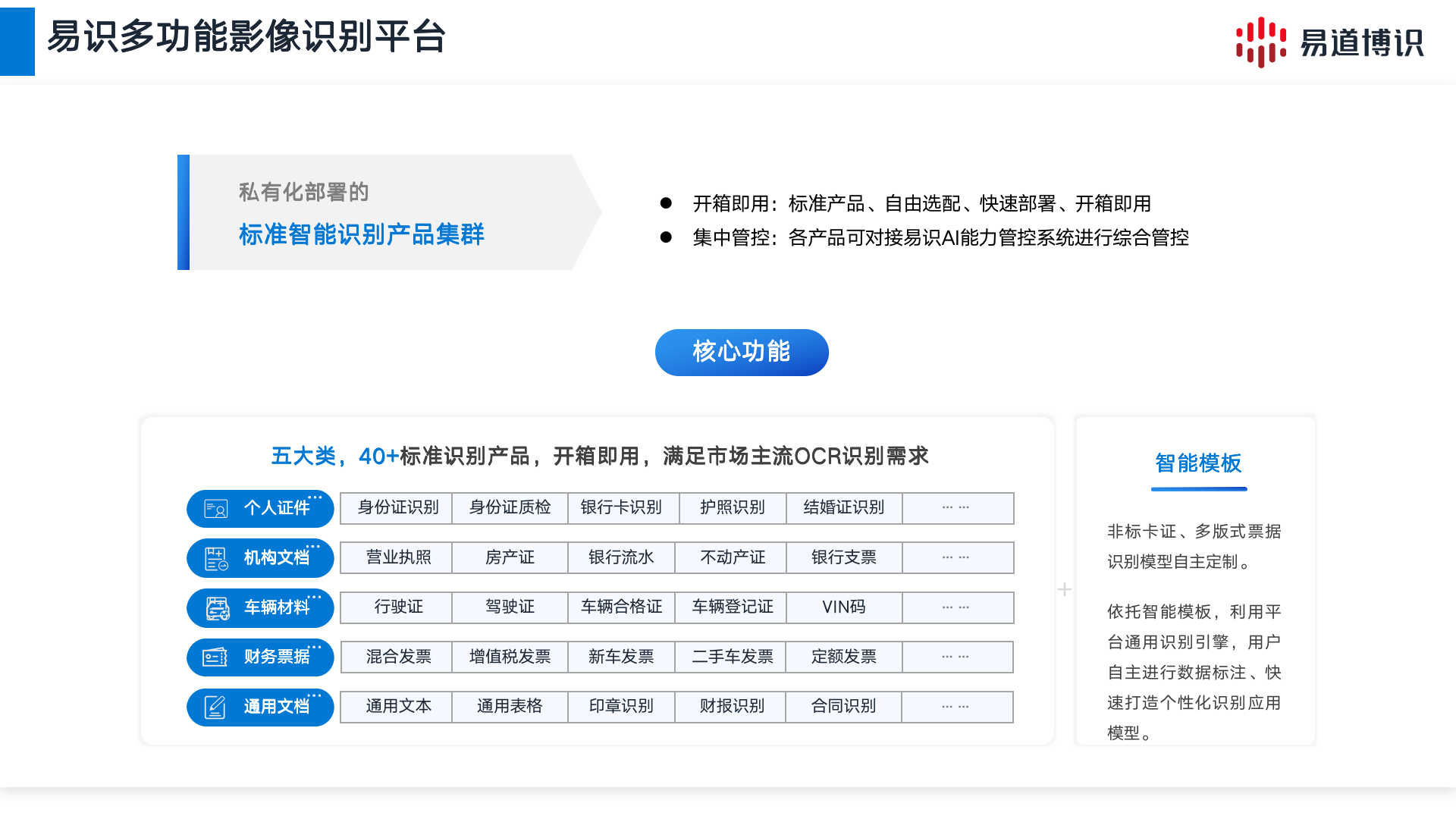 易識(shí)多功能影像識(shí)別平臺(tái)是一款基于深度學(xué)習(xí)技術(shù)開(kāi)發(fā)、私有化部署的標(biāo)準(zhǔn)智能識(shí)別產(chǎn)品集群,可滿足卡證識(shí)別、票據(jù)識(shí)別、文檔識(shí)別等50余種市場(chǎng)主流OCR需求。憑借具有自主知識(shí)產(chǎn)權(quán)的核心算法,易識(shí)多功能影像識(shí)別平臺(tái)可準(zhǔn)確、快速識(shí)別復(fù)雜背景中的印刷文字、手寫(xiě)文字、印章、表格等多形式文本內(nèi)容。