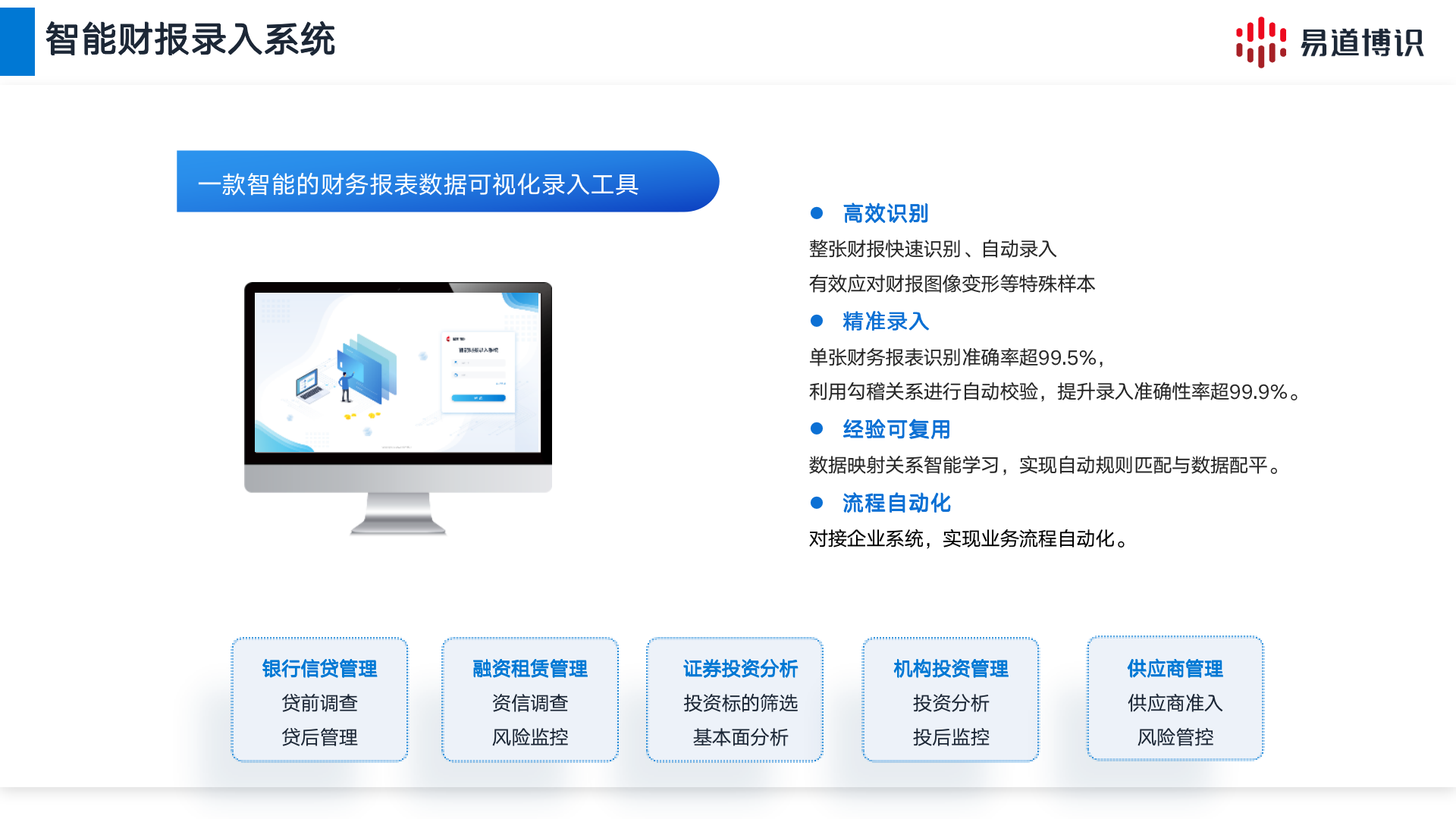 智能財(cái)報(bào)錄入系統(tǒng)是一款智能的財(cái)務(wù)報(bào)表數(shù)據(jù)可視化錄入工具,支持整張財(cái)報(bào)快速識(shí)別、自動(dòng)錄入,能有效應(yīng)對(duì)財(cái)報(bào)圖像變形等特殊情況,在規(guī)范樣本下單張財(cái)務(wù)報(bào)表識(shí)別準(zhǔn)確率平均超過(guò)99.5%,利用勾稽關(guān)系進(jìn)行自動(dòng)校驗(yàn),錄入準(zhǔn)確性超99.9%。系統(tǒng)可直接對(duì)接企業(yè)系統(tǒng),實(shí)現(xiàn)業(yè)務(wù)流程自動(dòng)化。