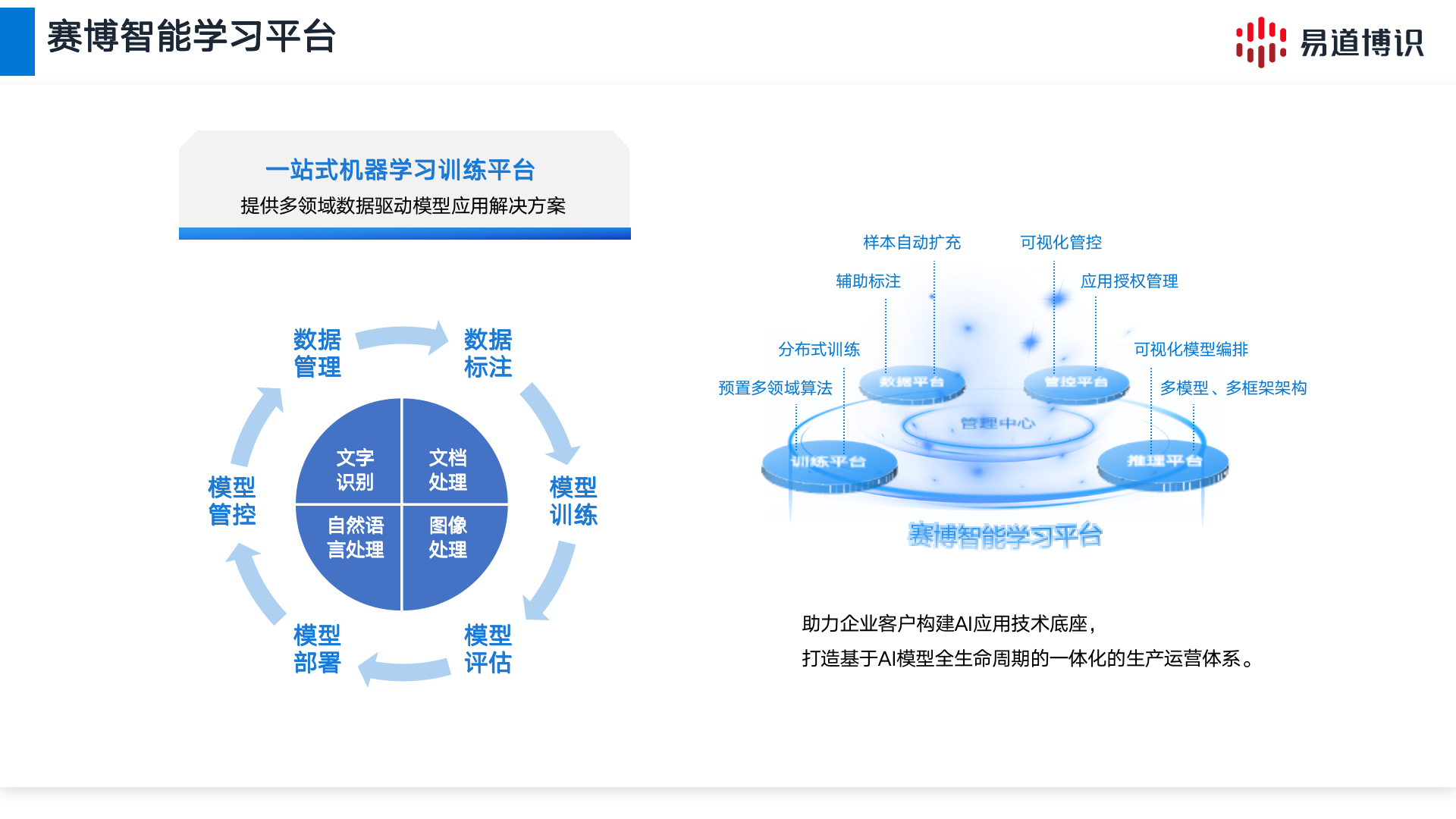 賽博智能學習平臺是基于最前沿AI技術打造地一站式機器學習訓練平臺,可提供智能識別、圖像處理、文檔處理、自然語言處理領域數據驅動模型應用的現場高效解決方案,客戶通過該平臺可自主完成數據標注、模型訓練、推理、部署、應用全過程,助力金融機構基于AI模型全生命周期建設標準化、一體化、體系化的生產運營體系。