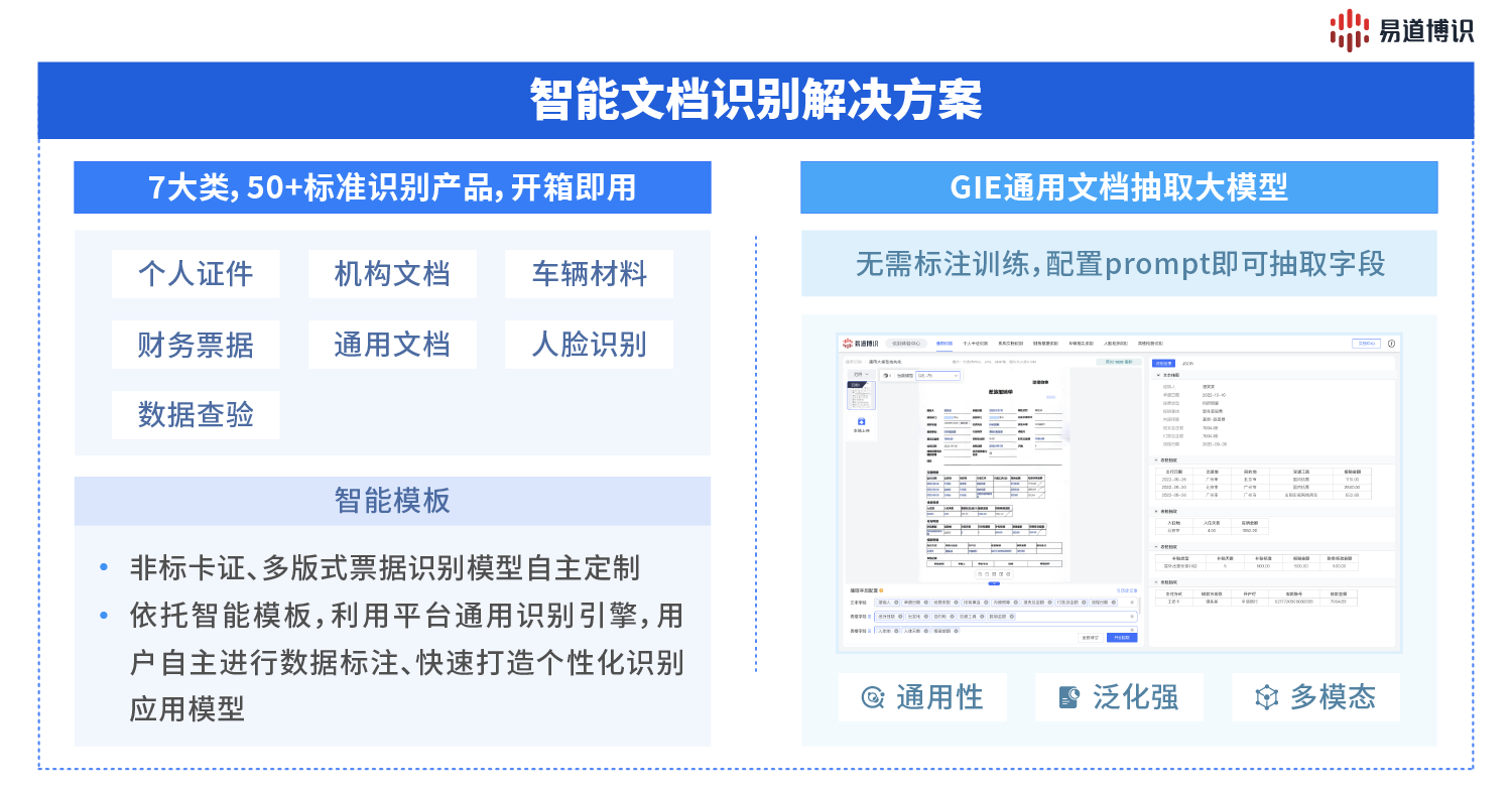 易道博識作為領先的智能文檔處理專家,核心產(chǎn)品之一“易識”憑借基于深度學習的OCR實現(xiàn)了多種證件(包括營業(yè)執(zhí)照、身份證等)的精準識別?!耙鬃R”通過開放的API接口,讓開發(fā)者可以輕松集成OCR功能,用于遠程開戶、在線驗證和移動支付場景。此外,移動端SDK支持用戶通過手機完成證件識別操作。私有化部署則可以保證數(shù)據(jù)不出企業(yè), 確保信息處理的私密性和合規(guī)性。