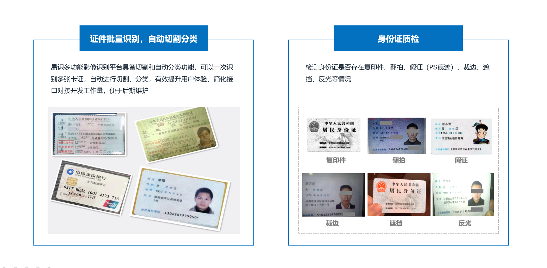 通過領先的深度學習算法和海量數據訓練,實現了99.5%的超高識別準確率,證件實現毫秒級識別。目前已支持7大類,60多種識別產品,覆蓋企業主流識別需求。