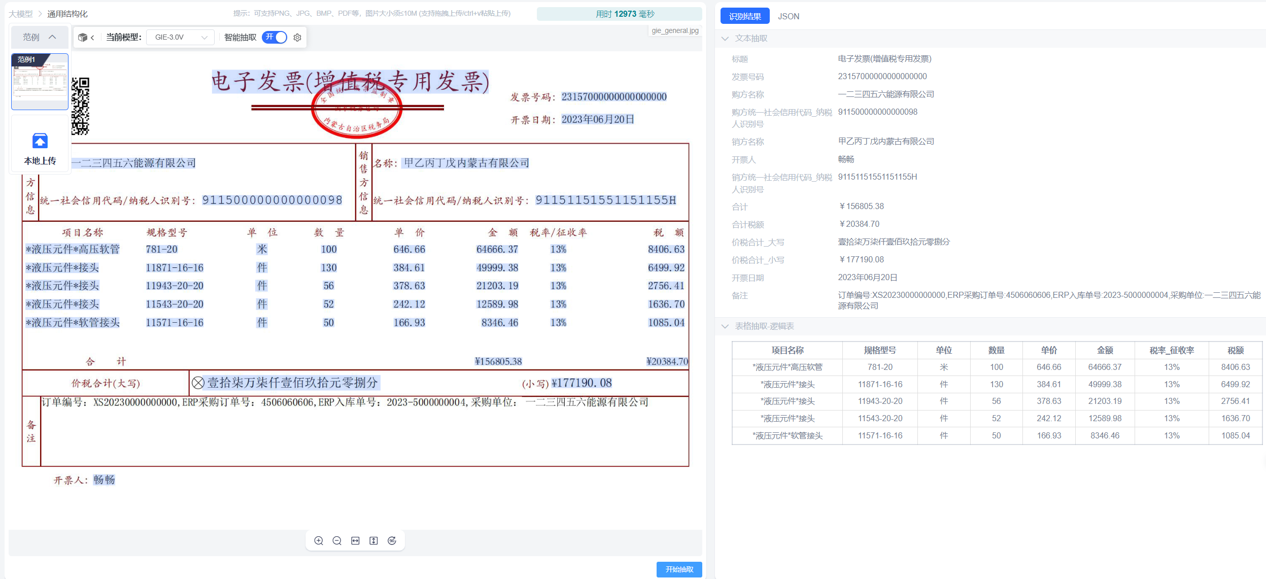 ○ 更強溯源:在輸出結構化數據(如JSON)的同時,能夠將每一個抽取字段以及表格區域精準關聯回原始單據的坐標位置,實現了數據的可追溯、可核驗。