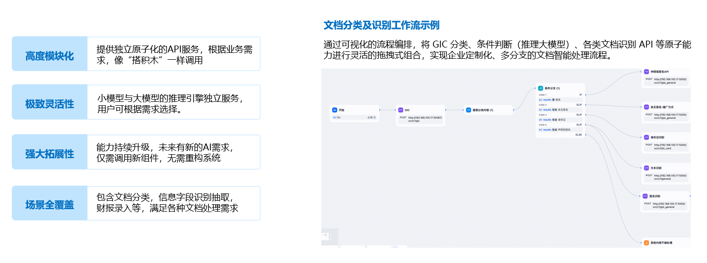 業務人員可以像“搭積木”一樣,通過簡單的拖拽操作,將文檔分類、各類文檔識別等AI原子能力,靈活組合成符合自身需求的、多分支的定制化工作流。