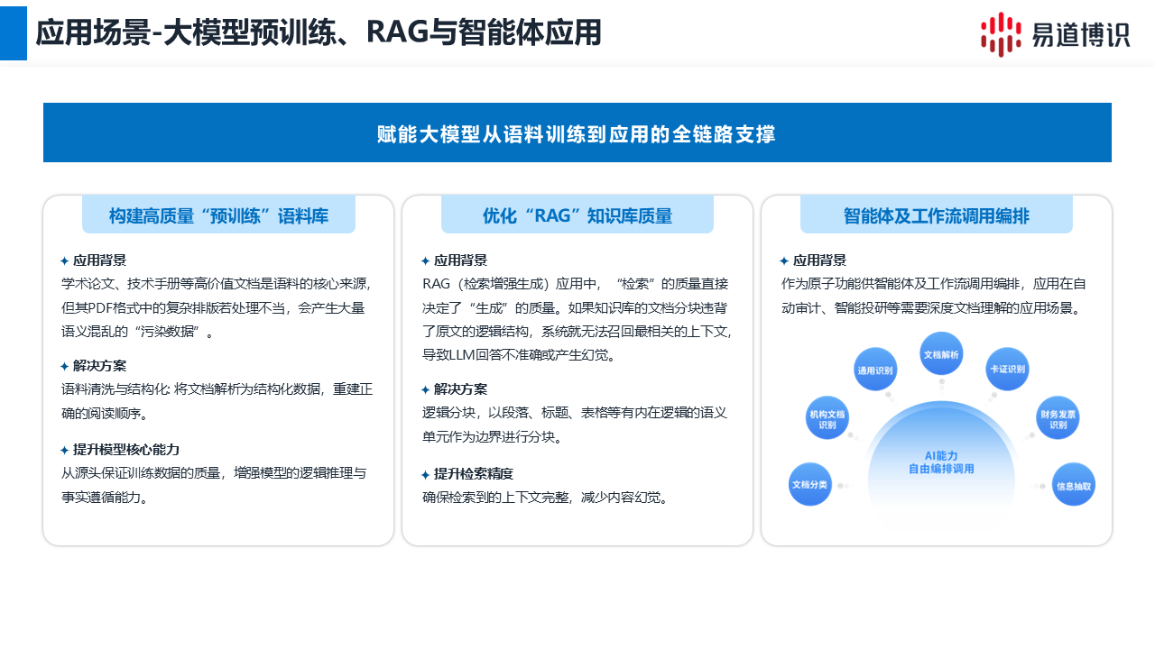 ●支撐智能體及工作流調用:系統可作為一項原子AI能力,被智能體(Agent)及工作流平臺靈活調用編排,應用于自動審計、智能投研、合規審查等需要深度文檔理解的復雜應用場景。