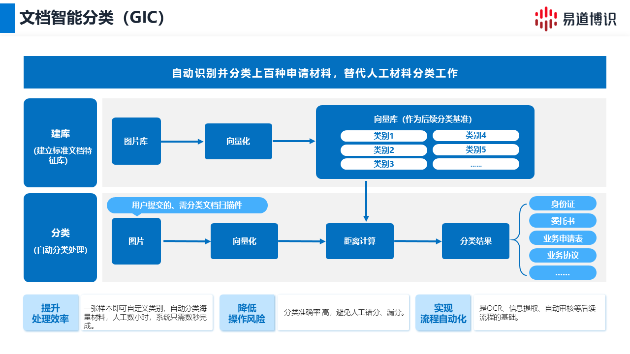 機(jī)構(gòu)開戶等需要批量上傳影像資料的場景中,業(yè)務(wù)人員只需將客戶提供的文件上傳,DeepIDP即可對影像進(jìn)行智能分揀和精準(zhǔn)歸類,自動識別出哪些是營業(yè)執(zhí)照,哪些是法人身份證,哪些是授權(quán)委托書,整個(gè)過程無需人工干預(yù)。