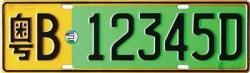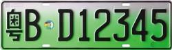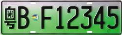 綠底的為新能源汽車專用號牌,新能源汽車號牌為漸變綠色,大型新能源汽車號牌為黃綠雙拼色(地區代碼部分為黃色,號碼部分為綠色)。