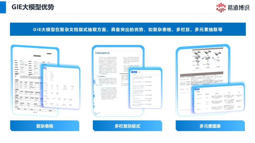 而隨著以Transformer架構為代表的大模型的興起,文檔處理也迎來了新的發展機遇。大模型技術憑借其強大的語義理解能力、跨模態學習能力和泛化能力,能夠有效克服傳統OCR技術的局限性,實現對各種復雜場景文檔的高精度、高效率識別和處理。易道博識正是敏銳地洞察到了大模型在文檔智能領域的巨大潛力,推出了GIE大模型(OCR大模型)。