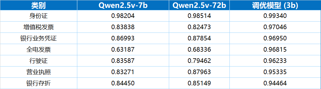 評測結果顯示,一個30億參數的多模態大模型經過二次訓練后,其在多種真實業務票據上的端到端識別準確率,不僅高于70億參數的原生模型,甚至全面優于720億參數的原生模型。